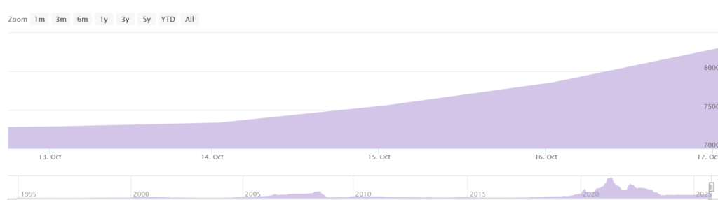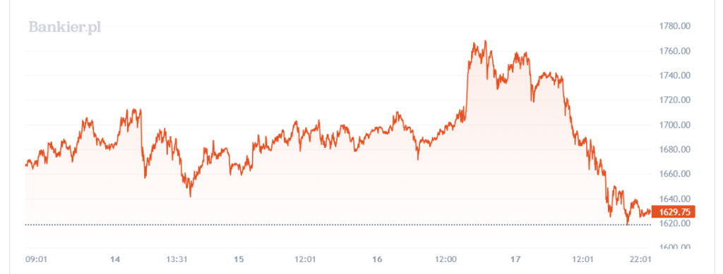 16 października kurs dynamicznie wzrósł, przebijając chwilowo poziom 1770 USD, co było efektem poprawy nastrojów na rynkach surowców i lekkiego osłabienia dolara amerykańskiego. Niestety, wzrost ten okazał się krótkotrwały — następnego dnia nastąpiła korekta i notowania powróciły w okolice 1630 USD.