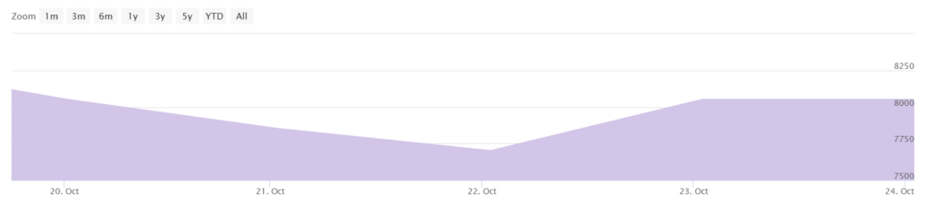 📈 Od 22 października pojawiły się oznaki stabilizacji. Popyt techniczny w rejonie 7500–7600 USD pozwolił na odbicie, które utrzymało się do końca tygodnia. W piątek (24 października) notowania powróciły w okolice 8000 USD za uncję.