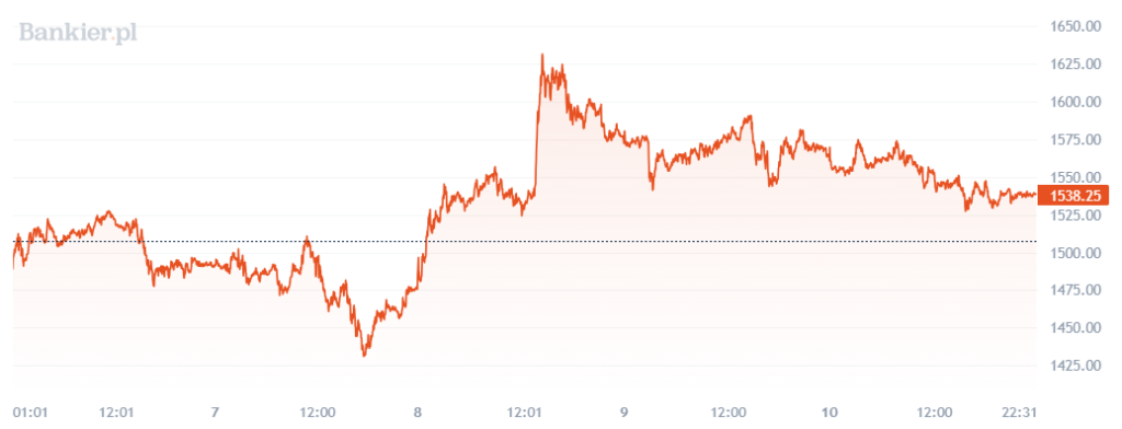 Notowania powróciły w okolice 1520–1550 USD, gdzie obecnie widoczna jest próba stabilizacji rynku.