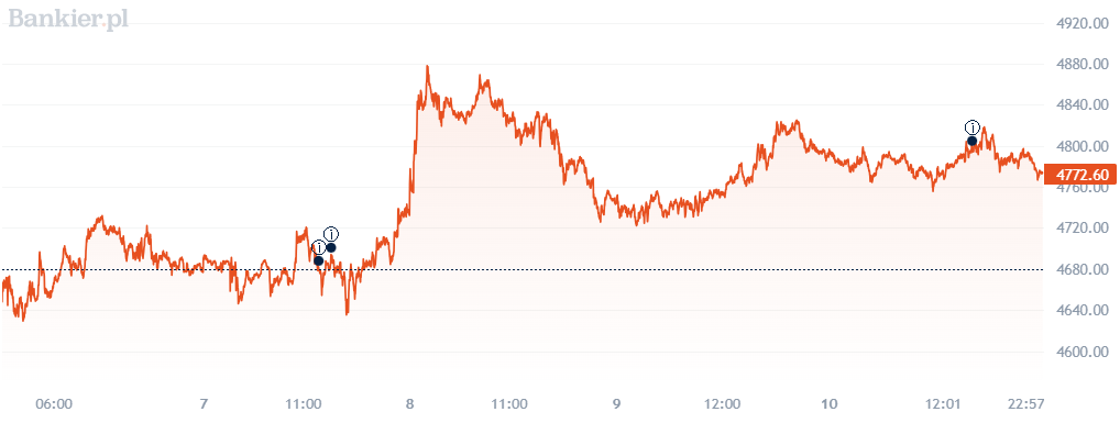 Końcówka tygodnia przyniosła ponowną stabilizację i lekkie cofnięcie do poziomu 4770 USD, co wskazuje na brak jednoznacznego kierunku rynku w krótkim terminie.